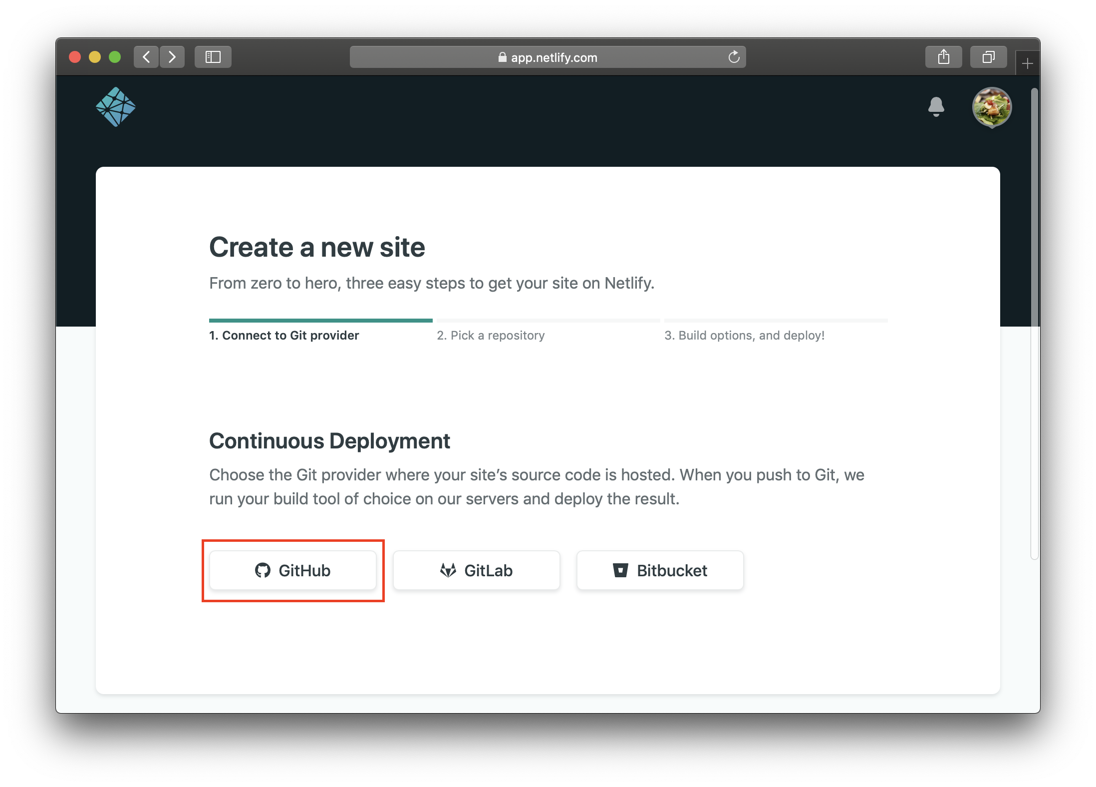 원하는 방식으로 가입 New site from Git 버튼을 클릭하고, github을 연결하자.