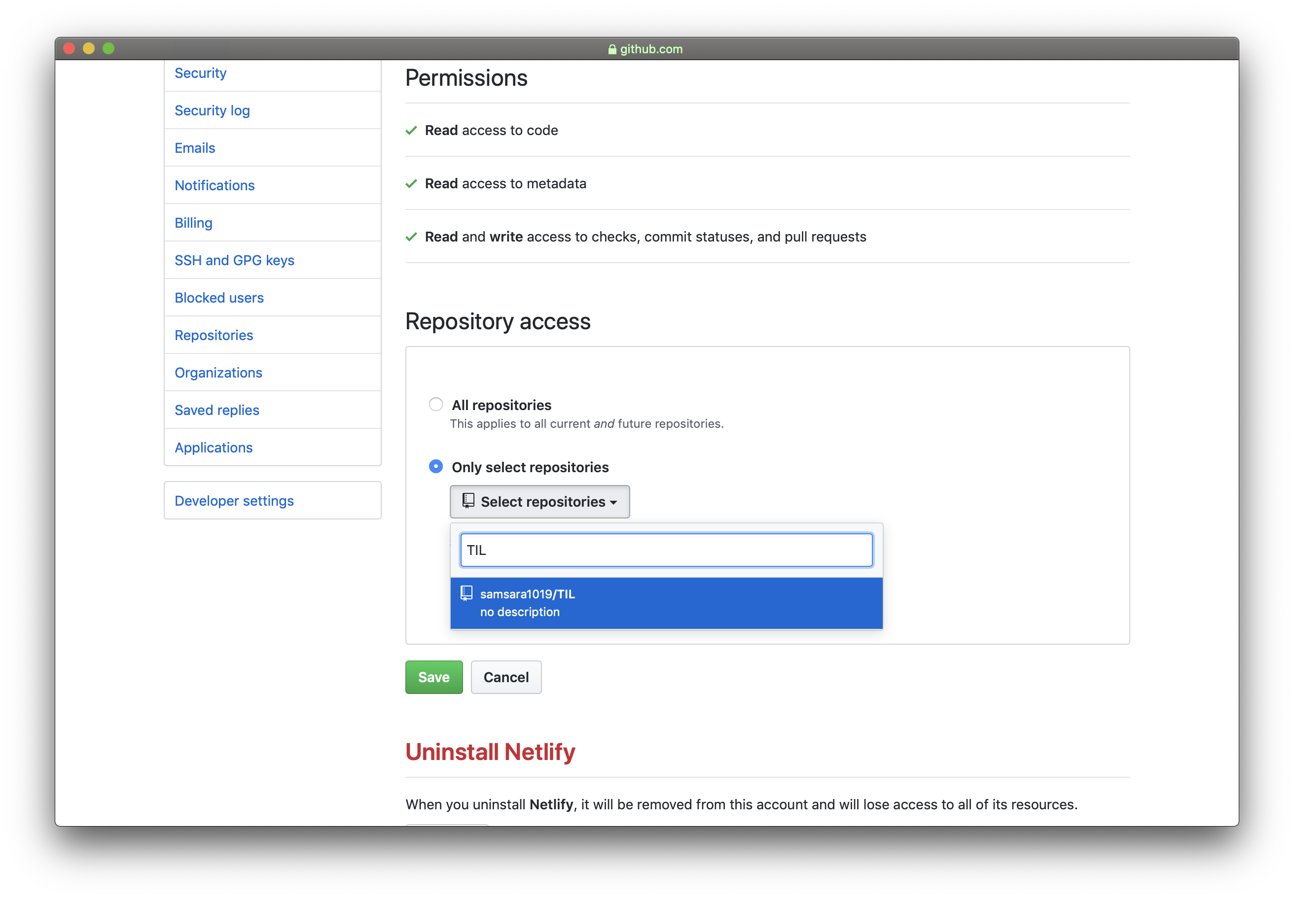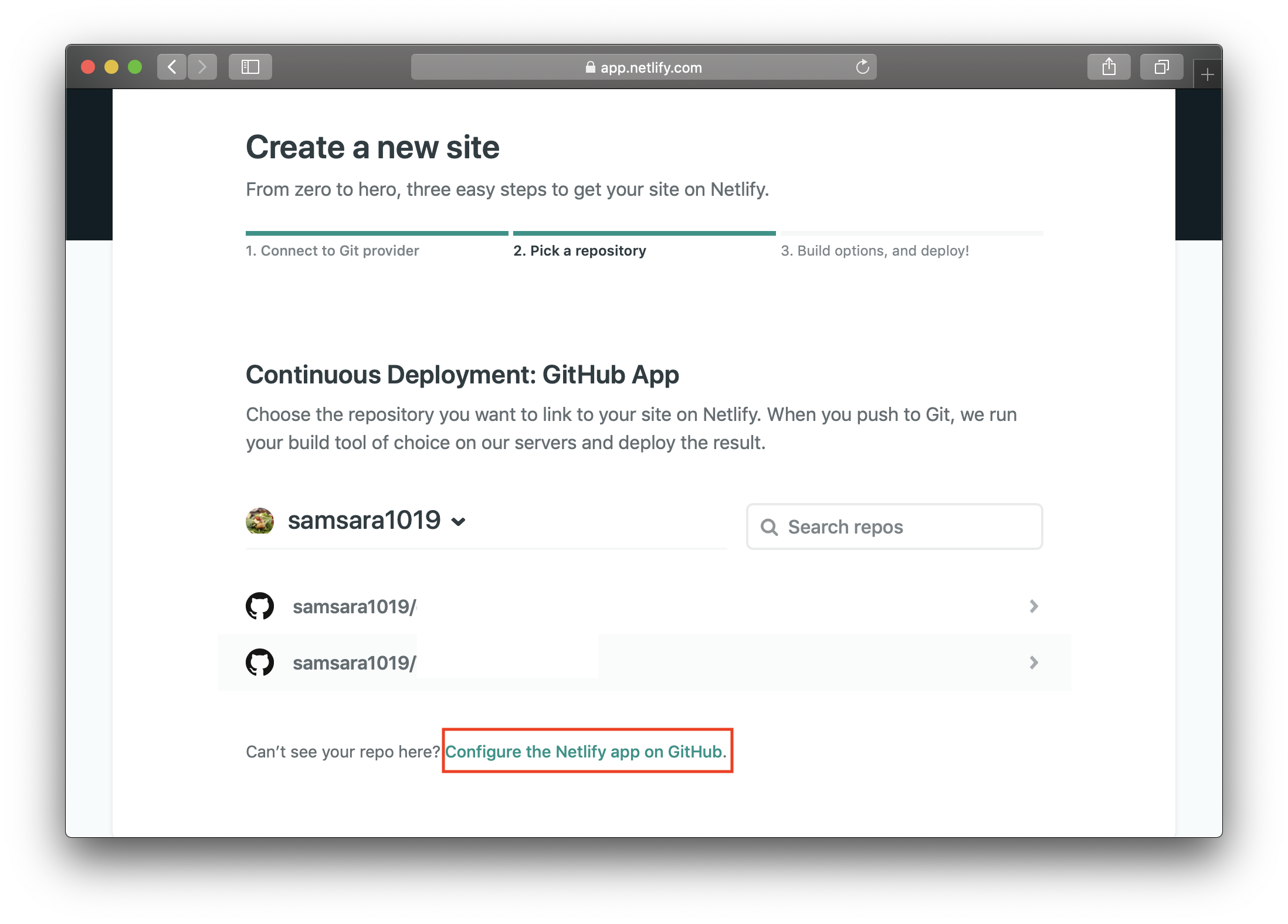 원하는 레포지토리가 없다면 Configure the Netlify app on GitHub. 버튼을 통해 등록한 후에 진행한다.
